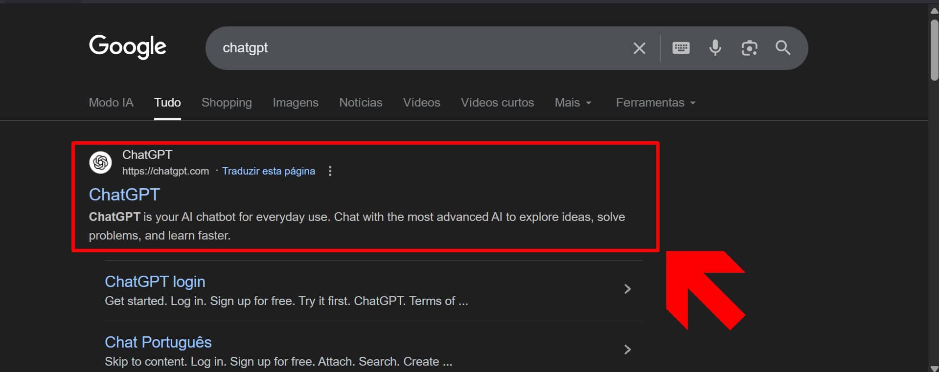 Acesse a barra de pesquisa do Google e inicie uma busca por ChatGPT. Em seguida, clique no primeiro resultado.